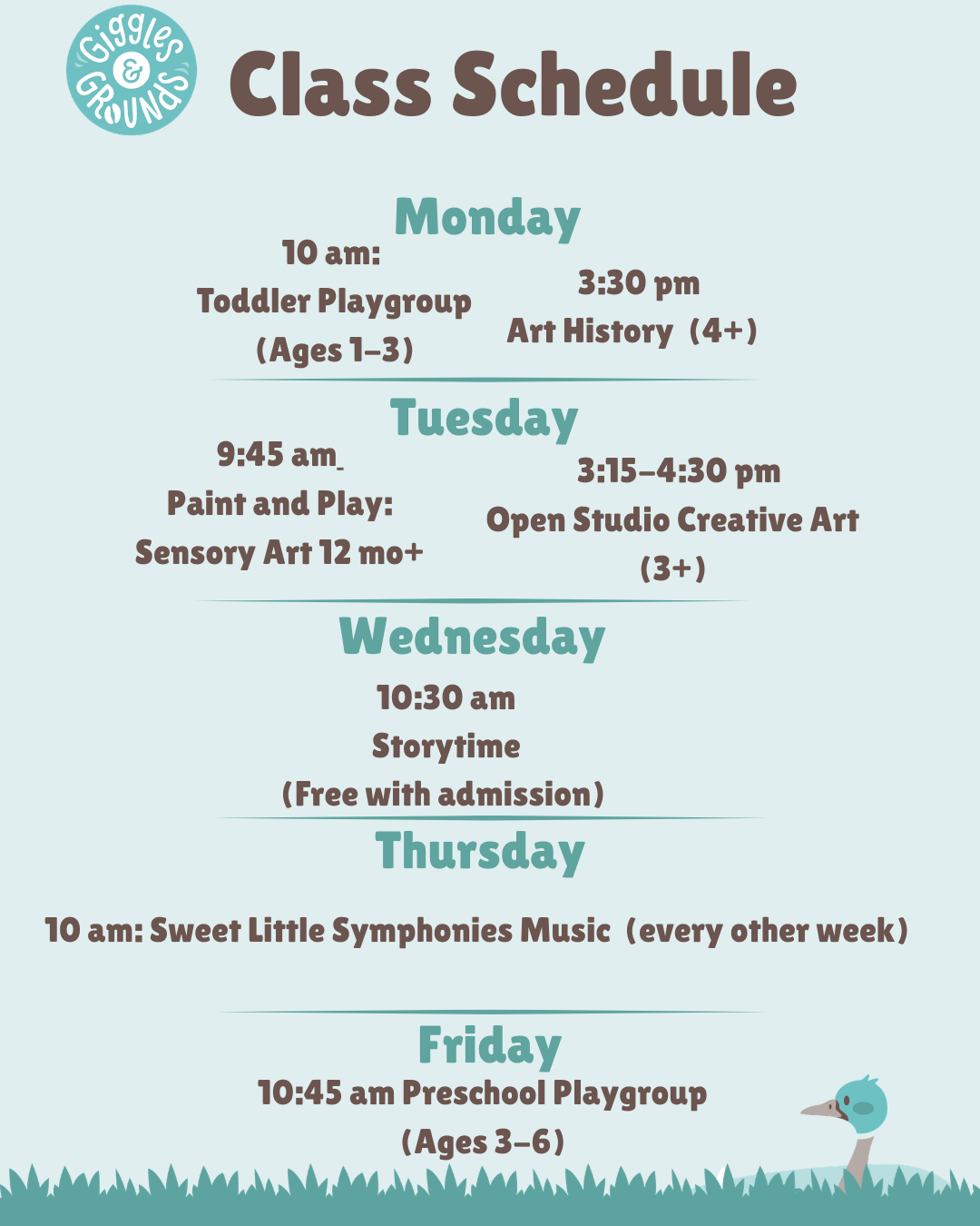 6 week session: 30-40 mins of teacher led time followed by admission to the playspace - 150$ (Members receive a 20% discount - $120 per session)
